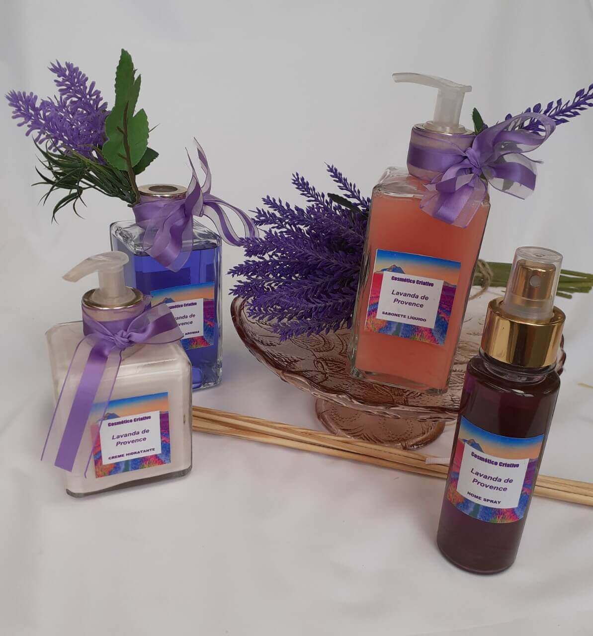 O combo luxo da “Coleção Lavanda de Provence” traz o sabonete líquido hidratante, o creme para mãos-luvas de silicone, o home spray e o difusor de varetas da coleção. São dois frascos de vidro, de 11,00 cm de altura por 5,80 cm de largura, um com 220 ml de sabonete líquido hidratante e o outro com 200 ml de difusor de varetas. Um frasco de vidro, de 7,80 cm de altura por 7,00 cm de largura, com 200 ml de creme para as mãos-luvas de silicone. Um frasco de plástico, de 12,00 cm de altura por 4,00 cm de diâmetro, com 120 ml de home spray. A Coleção “Lavanda de Provence” usa óleo vegetal de gérmen de trigo e óleo de silicone, extratos glicerinados de amêndoas e de calêndula e a manteiga de karité. Validades de 1 ano para o sabonete líquido e o creme para mãos. Validades de 2 anos para os aromatizadores de ambiente. Produção sob encomenda de 5 dias úteis, incluindo embalagem de papel craft com papel de seda, um lettering e o briefing da coleção. Há a versão econômica deste combo.