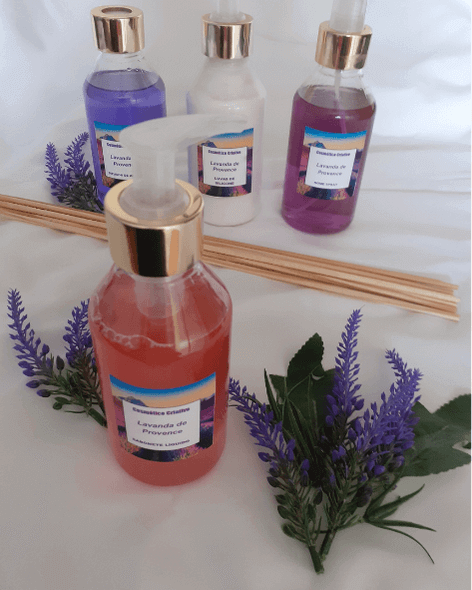O sabonete líquido é vendido em um frasco pet cristal contendo 200 ml do sabonete líquido hidratante com extratos glicerinados de amêndoas e de calêndula. Validade de 1 ano. Produção sob encomenda de 5 dias úteis. Preço incluindo embalagem de papel craft com papel de seda, um lettering e o briefing da coleção. Os sabonetes líquidos “Coleção Lavanda de Provence” são hidratantes e nutritivos para a pele. São indicados especialmente para peles maduras, secas, descamativas, sensíveis e desidratadas. É recomendável que se ensaboe as mãos e espere um pouco antes de enxaguá-las, para que haja a ação desses extratos sobre a pele. E não precisa usar muito em cada lavagem porque o poder da espuma é grande mesmo em pequenas porções utilizadas.